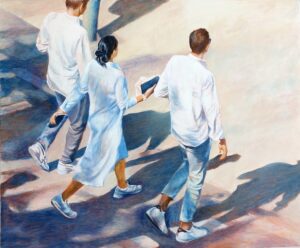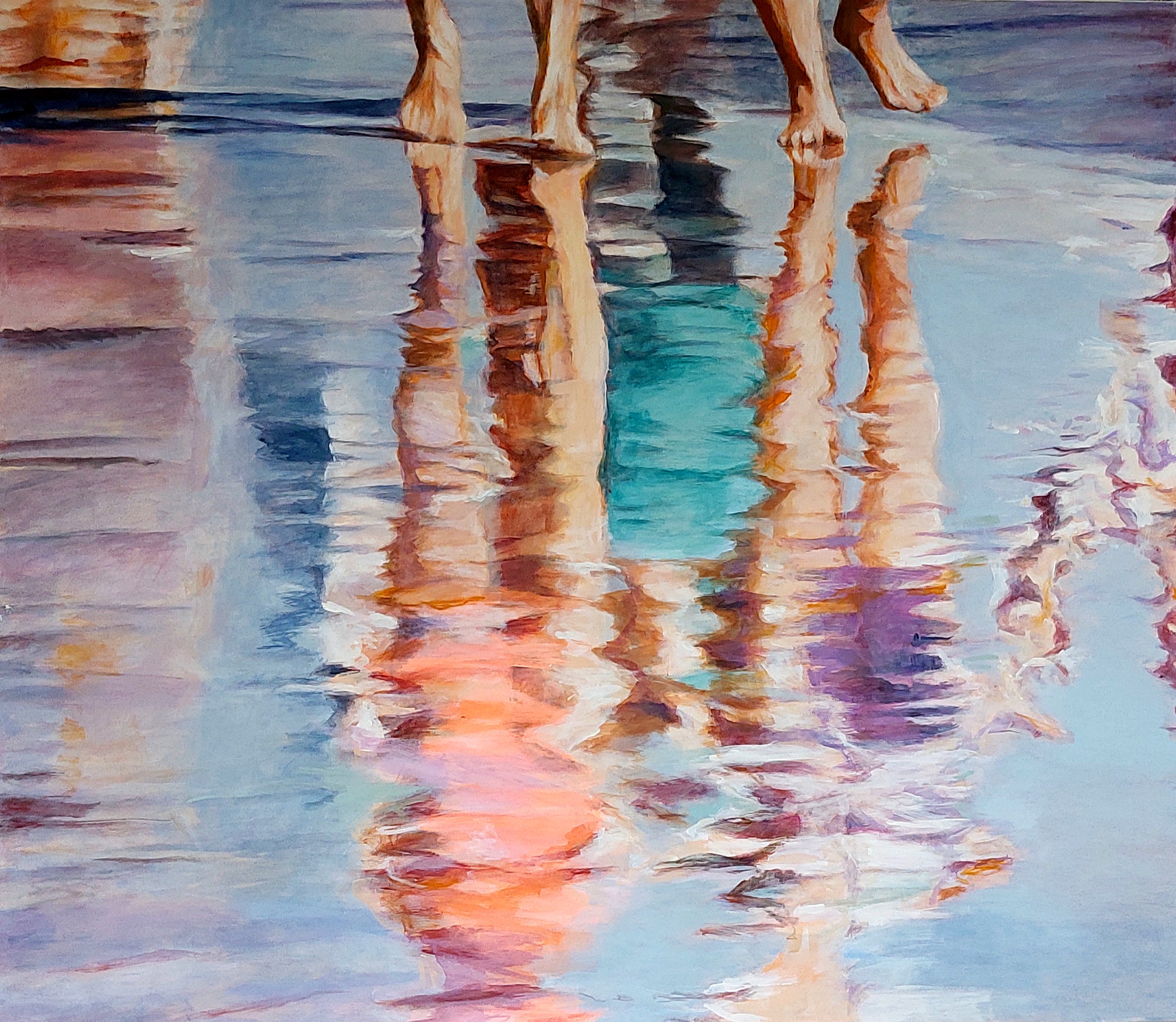 In den Arbeiten von Mo Kilders begegnen wir Momenten purer Unbeschwertheit: Spaziergänger am Strand, Badende im azurblauen Wasser, das Spiel der Brandung an belebten Stränden oder das flüchtige Treiben urbaner Flaneure. Doch was auf den ersten Blick wie eine fotorealistische Momentaufnahme wirkt, entpuppt sich bei näherem Betrachten als eine komplexe Untersuchung von Wahrnehmung und Wirklichkeit.
